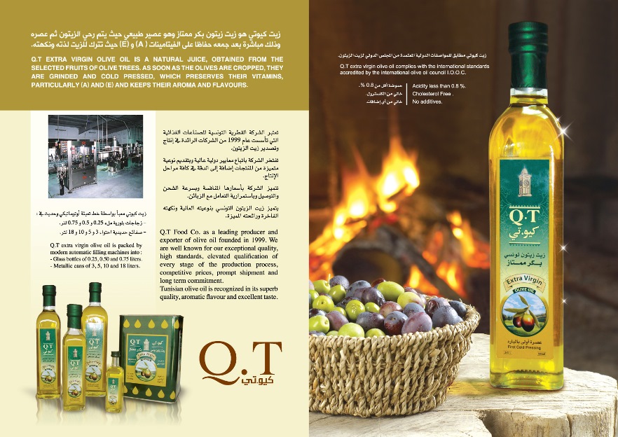 Q.T Extra virgin olive oil is a natural juice, obtained from the selected fruits of olive tree as soon as the olives are cropped, they are grinded and cold pressed which preserve their vitamins, particularly (A) and (B) and keeps their aroma and flavours. term commitment.